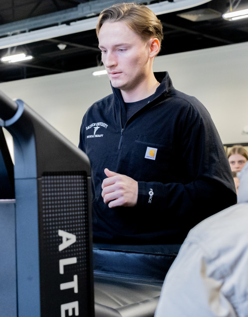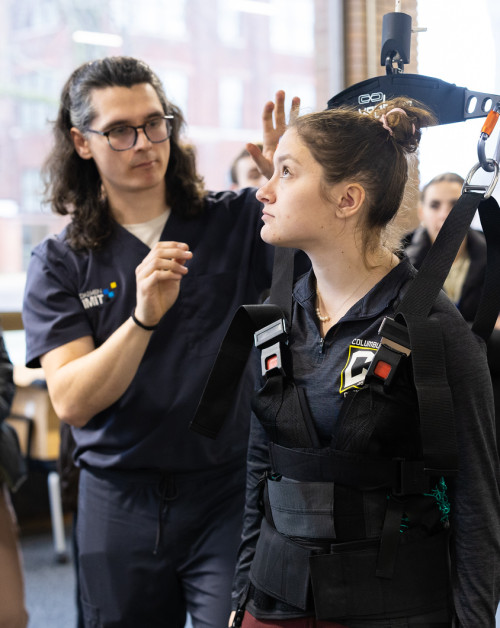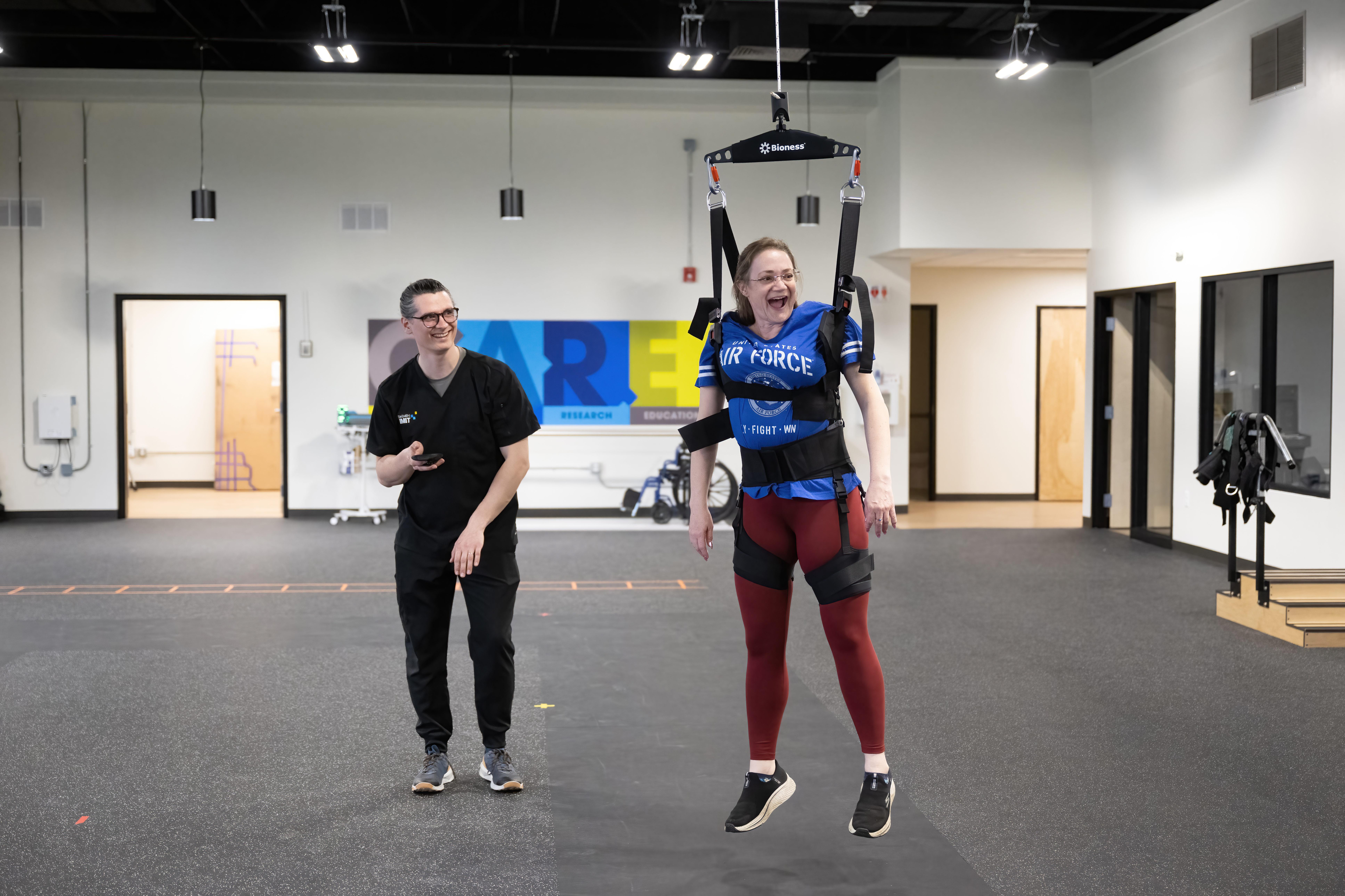 Veteran working with therapist in mobility harnass
