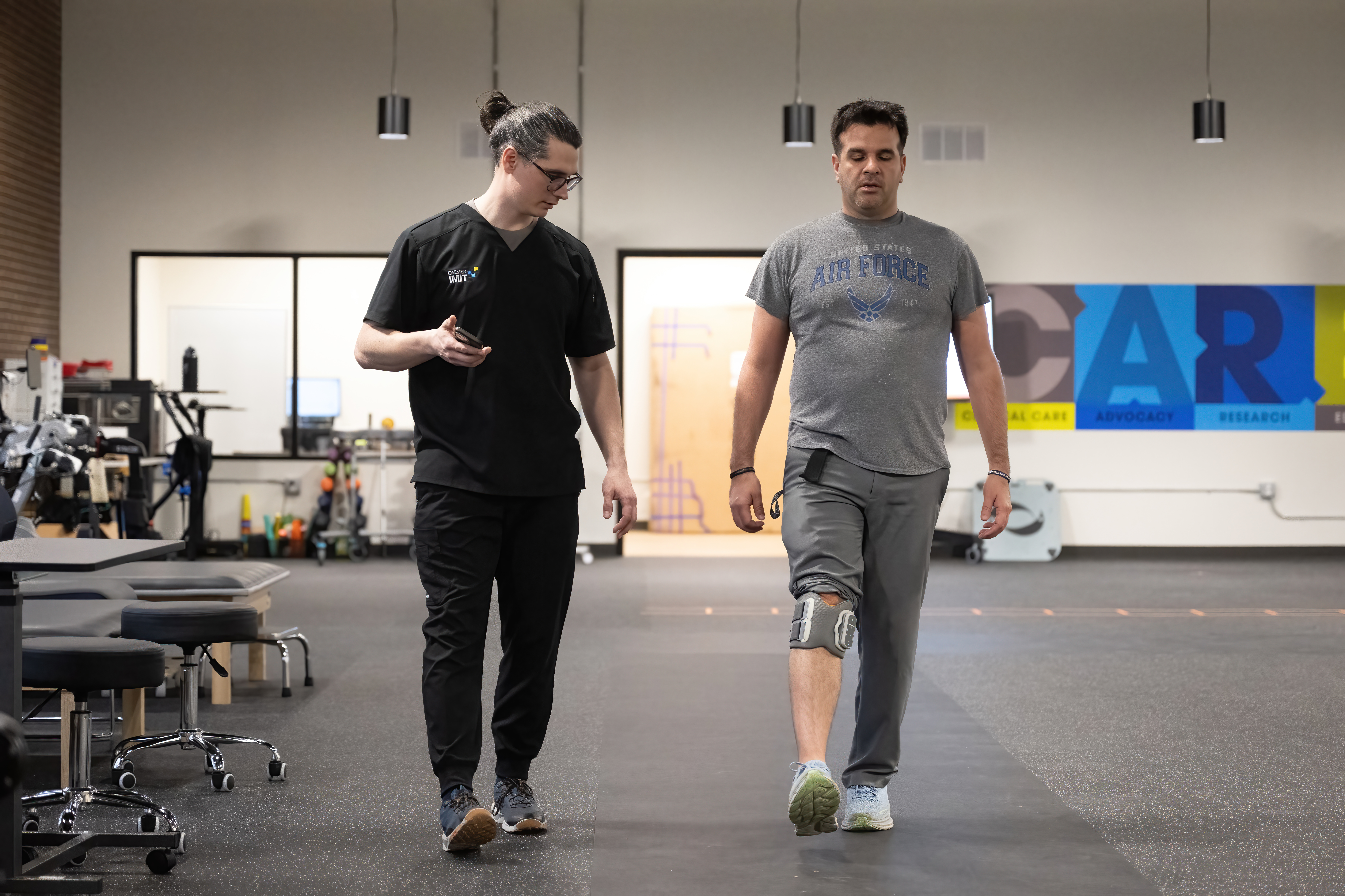 Patient and therapist walking in Kennedy Institute with device on shin