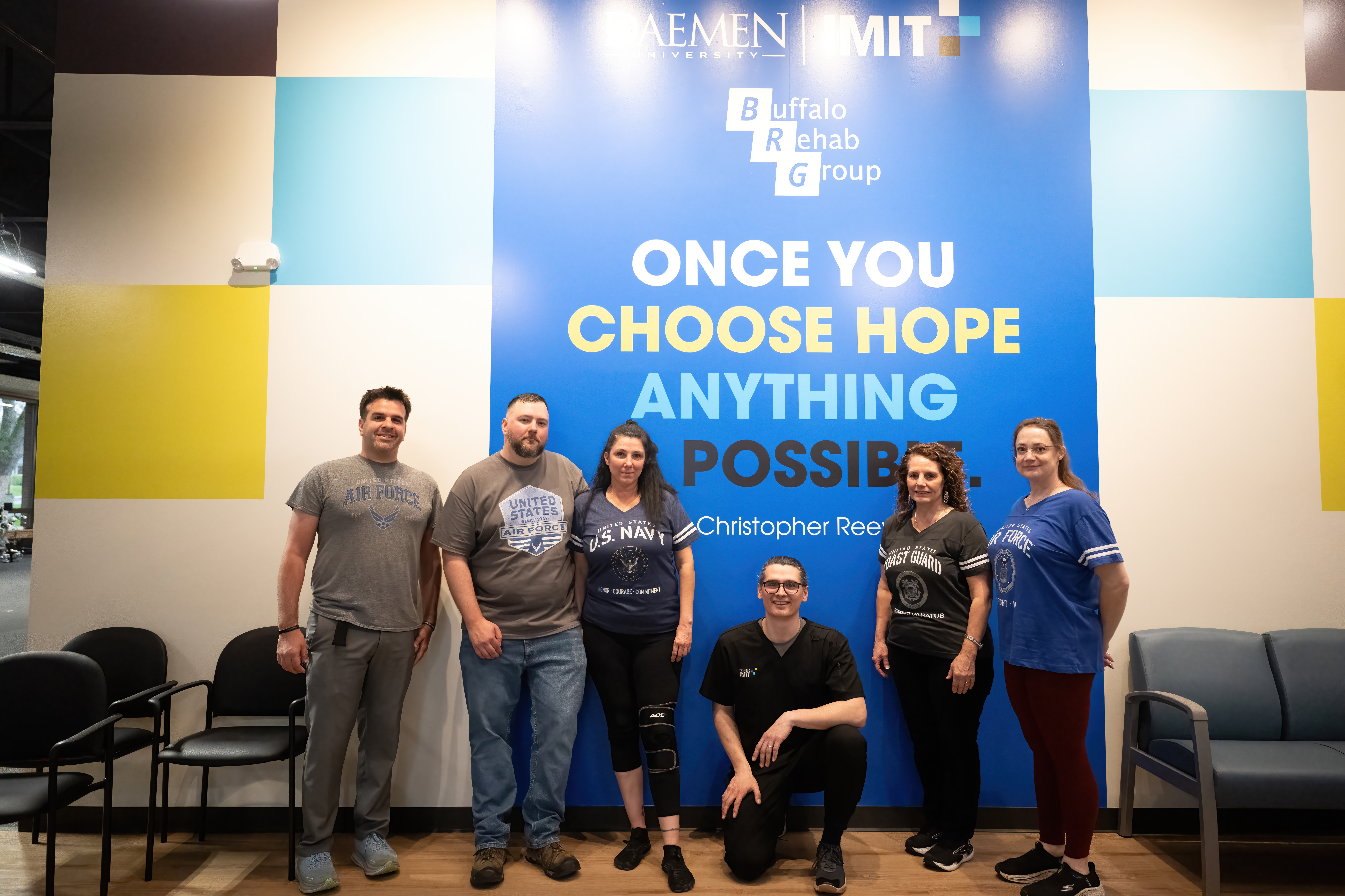 Group of veterans standing in front of sign at Kennedy Institute that says 'once you choose hope anything is possible'