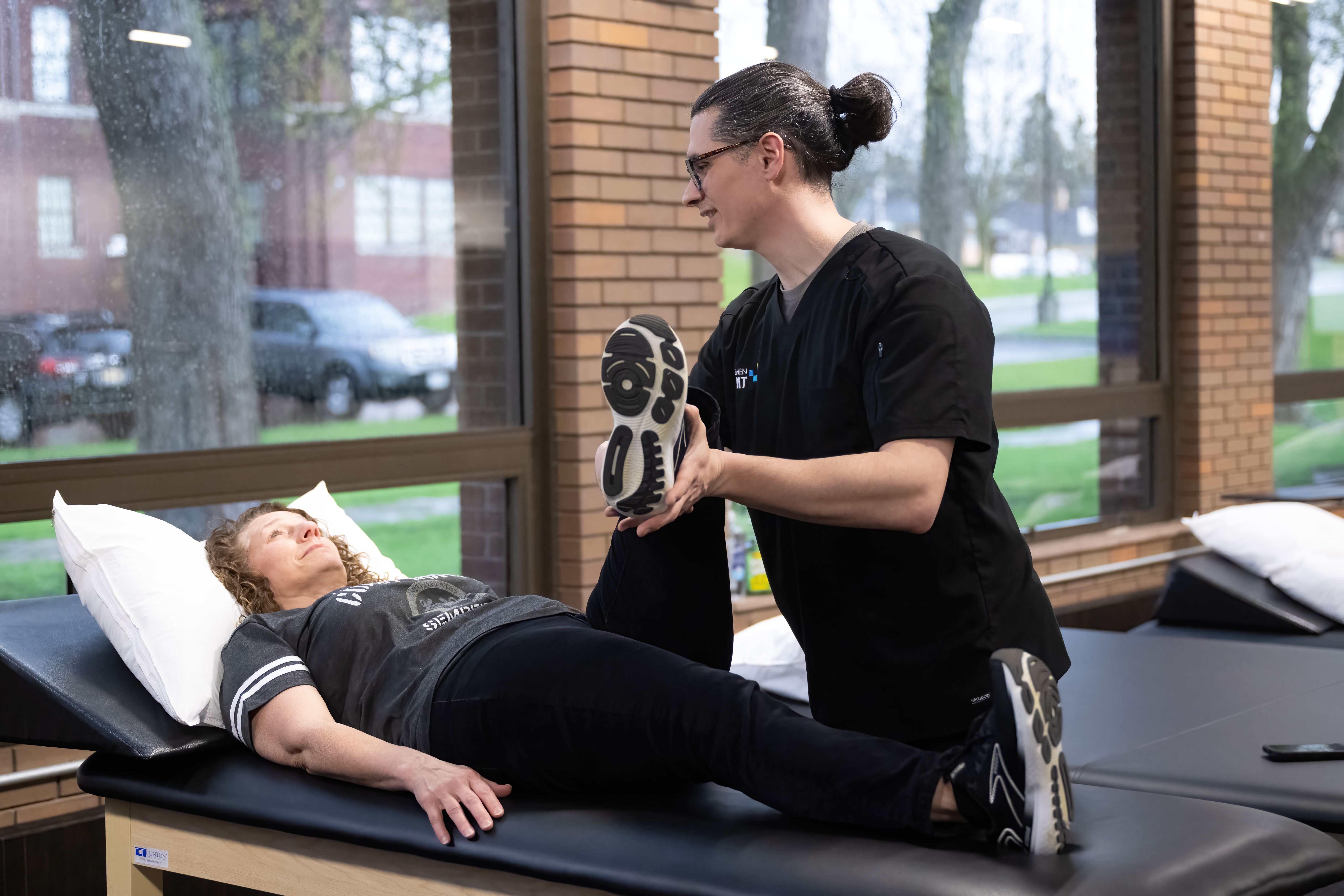 Therapist assessing hip flexibility while patient lies on exam table