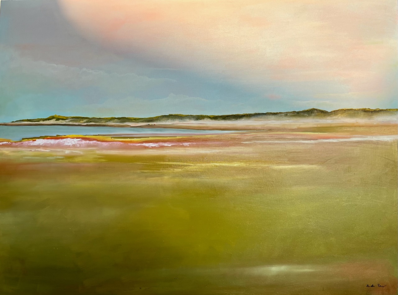 painting showing ocean viewed from a green bluff, sand dunes in the distance