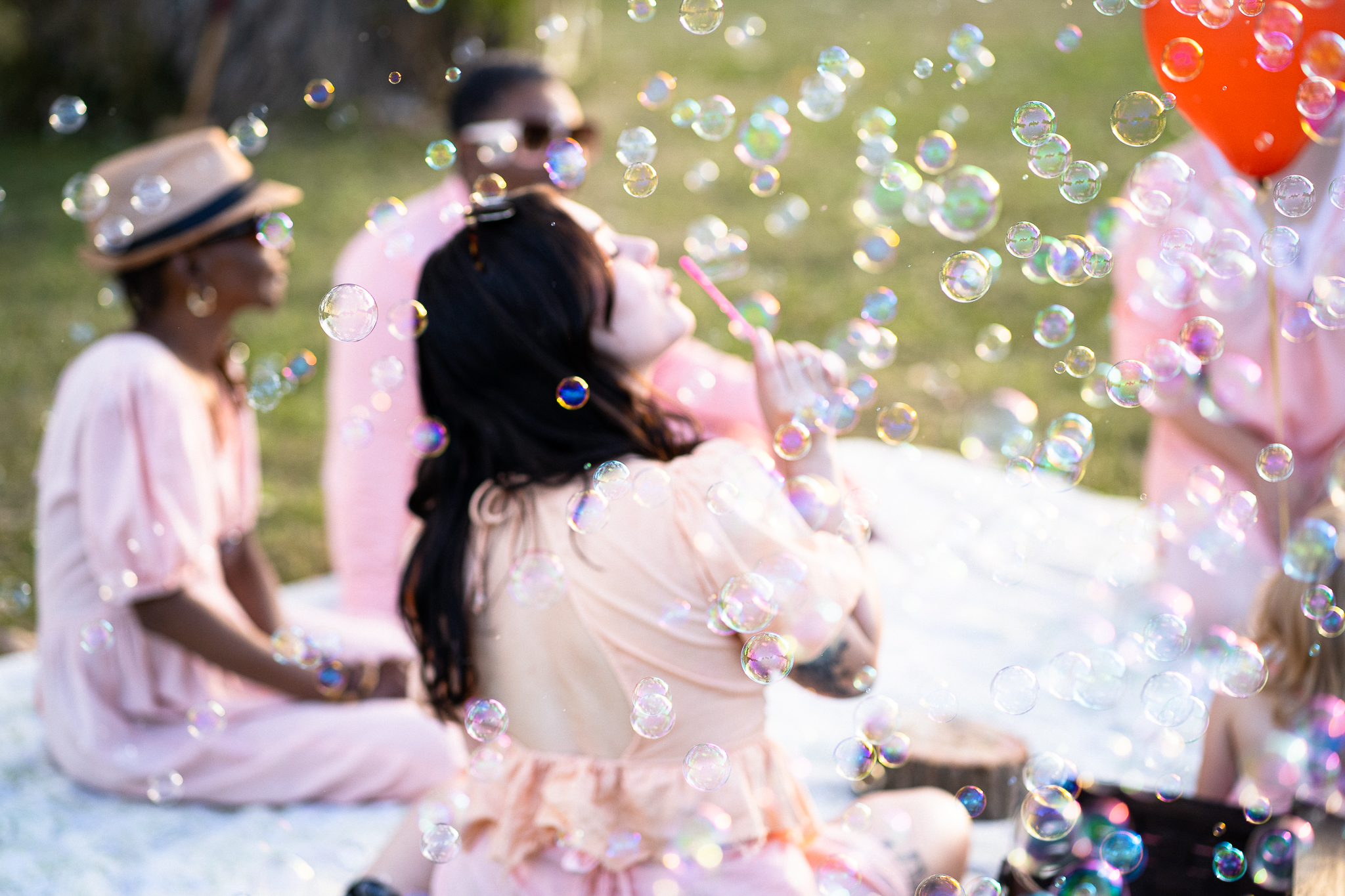 people dressed in pink sitting on a blanket outside blowing bubbles; a child is holding a red balloon