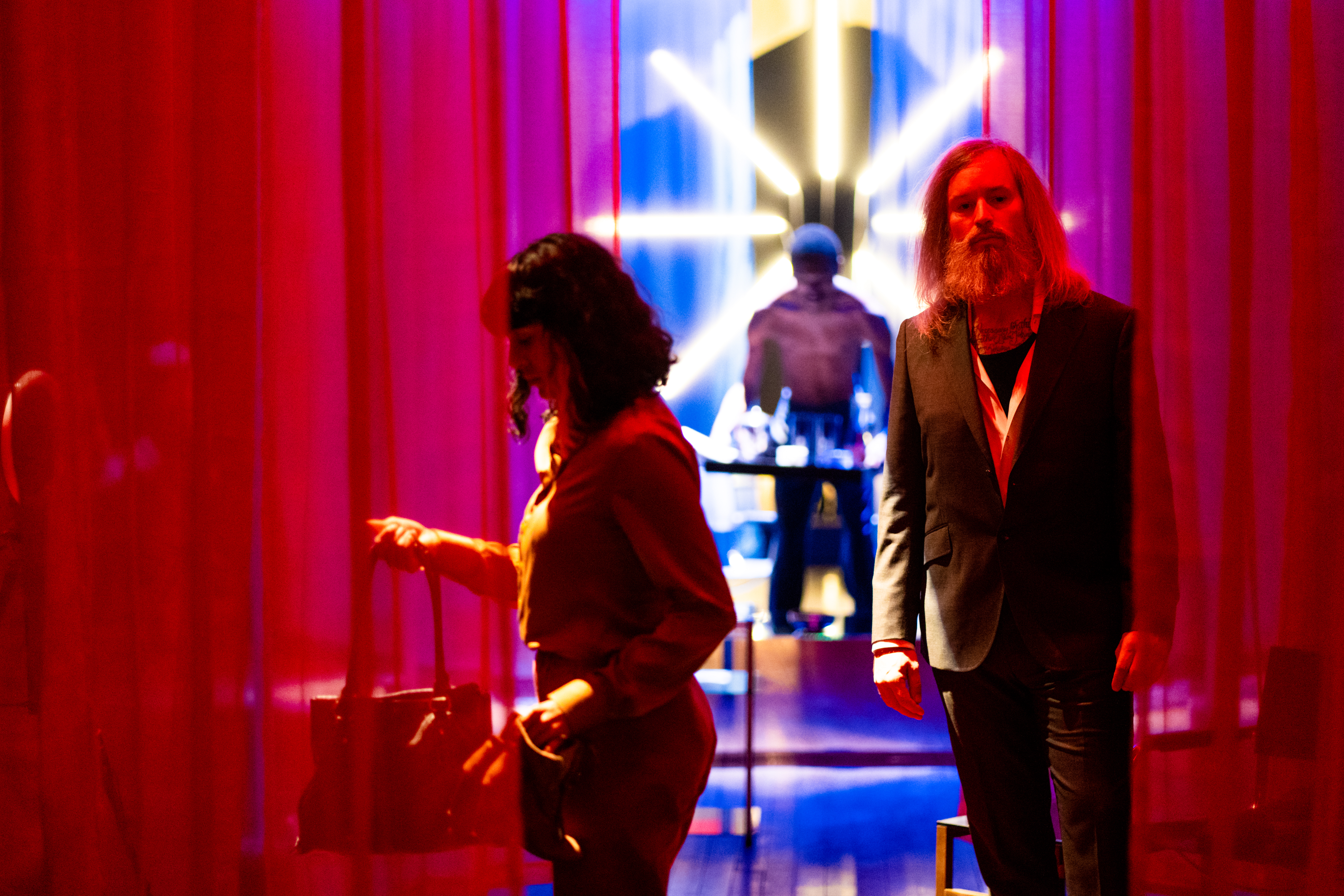 in the foreground a woman holding a purse and a man in a suit framed by red curtains on either side, which a figure visible in the background