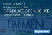 6:00 PM to 7:30 PM - John R. Yurtchuk Student Center - Social Room: Thinking About Graduate School? Come to our Graduate Open House on Wednesday, March 25, 2026 at 6:00 p.m. Meet faculty and current graduate students Learn about our generous tuition scholarships Explore career services for graduate students As a graduate student, your personal and professional growth never ends at Daemen College. Whether you are entering the field of education, healthcare, social work, or business, our graduate programs offer one-on-one attention, speed-to-degree, and a strong professional network. Our Graduate Programs Lead to Great Careers! Applied Behavior Analysis Education (virtual session only) Leadership and Innovation MBA MBA in Accounting Nursing (MS and DNP options) Paralegal Certificate Physical Therapy Physician Assistant Public Health (MPH) Social Work (MSW) Strategic & Analytical Management Certificate For more information or to register: Visit Daemen.edu/GradOH Text (716) 271-0454 Call (716) 839-8225