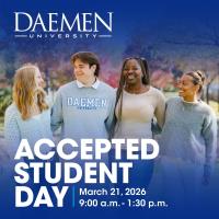 6:00 PM to 8:00 PM - Daemen Hall: The Office of Admissions will host an Accepted Student Reception on Tuesday, May 12, 2026. This is an event exclusively for accepted students! Whether you're coming to Daemen and looking to make new friends, or trying to decide if Daemen is the right fit for you: this event is about you! Meet some of your incoming fall 2026 classmates, current students, and see what Daemen has to offer for your college experience. Visit Daemen.edu/ASD for more information.