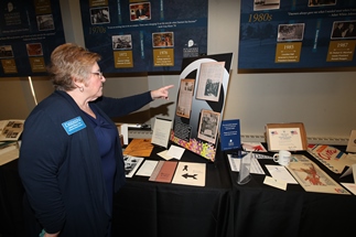 Pictured below: (left) Paul Saffrin is assisted at the center’s ribbon-cutting by his daughter, Fiona, with his wife, Melissa, looking on in the background, and Daemen President Gary A. Olson. (right) Alumna Jacki Rizzo ’70 views the memorabilia exhibit highlighting the college’s history.