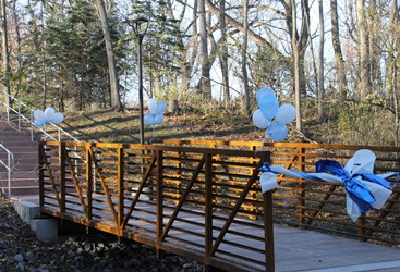 Set in an attractive wooded area on the south end of Daemen’s campus, the approximately 30-foot bridge is accessible from a recently installed parking lot located by Alumni House, which opened this fall for the Division of Institutional Advancement, and the college’s Honors House. The bridge spans a small culvert and leads to a walking path behind Schenck Hall.