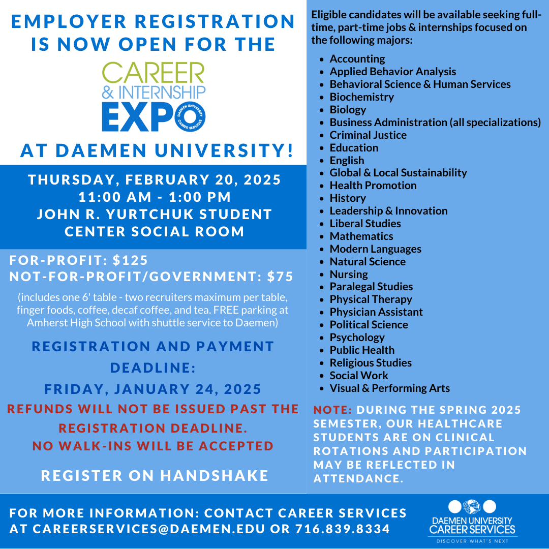 Register for the Daemen University Career & Internship Expo today! The Expo will take place on Thursday, February 19, 2026 from 11:30 am - 2:00 pm on Daemen's campus. Registration will be conducted via Handshake at this link. Please reach out to our team at 716-839-8334 or careerservices@daemen.edu with any questions. We hope to see you there!