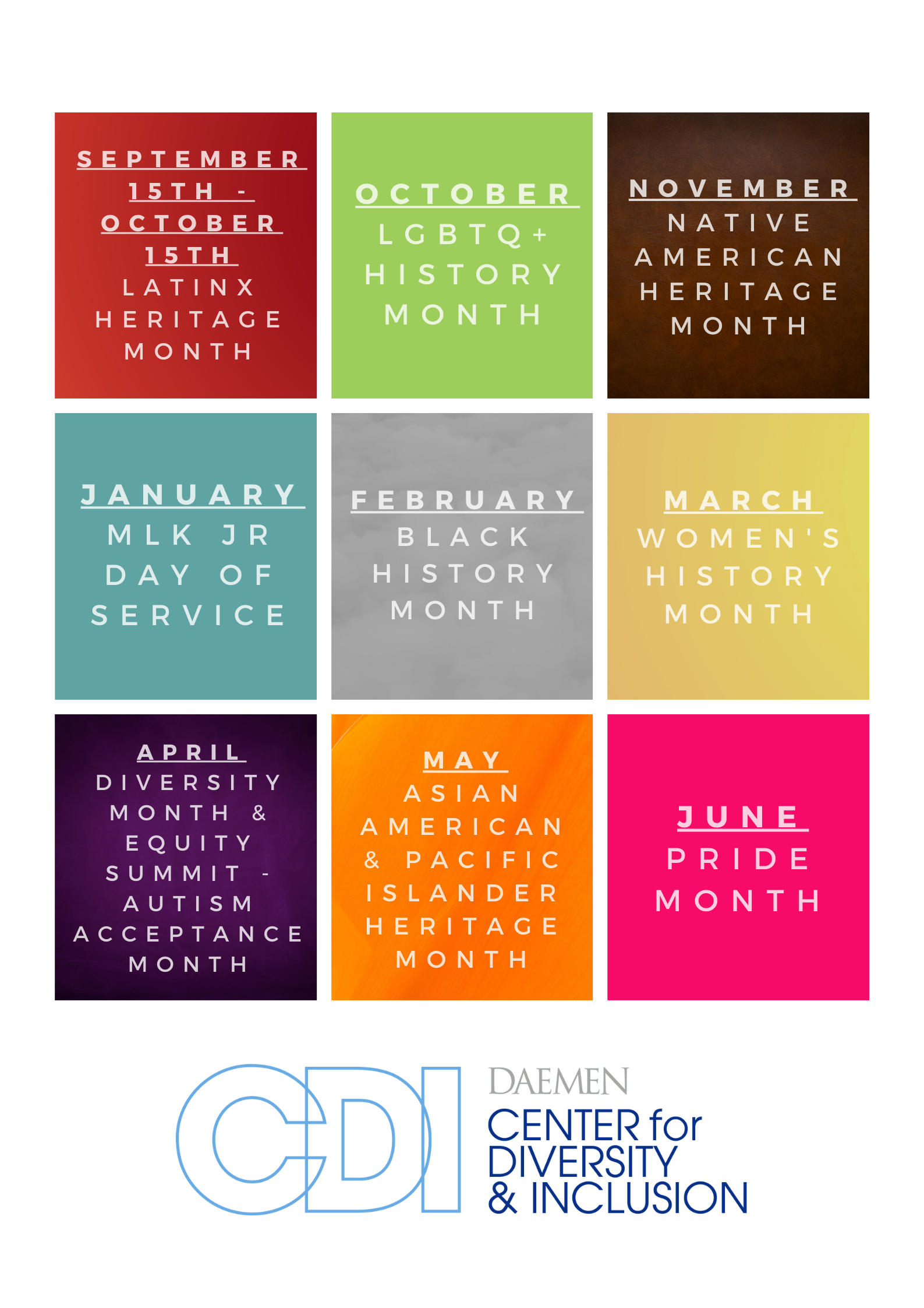 The HOPE Center is committed to ensuring that every student, staff member, faculty member, and community partner feels recognized, valued, and celebrated as an essential part of the Wildcat family. This commitment includes honoring holidays and significant dates that may not appear on the traditional U.S. calendar but hold deep meaning for members of our community. Through events and programs that highlight heritage months and culturally significant celebrations, we embrace the richness of our campus diversity and create opportunities for all students to share their culture, traditions, and stories with Daemen.