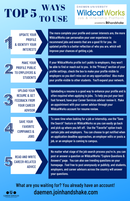 But there's a whole lot more where that came from? It's through this system that you'll find a full collection of career-related resources as well as personalized updates on opportunities to take advantage of and tasks to complete before graduating. Think of WildcatWorks as your one-stop-shop for building your brand and engaging with employers. Log in today using your Daemen email and password and complete your profile and put your best self forward to employers.